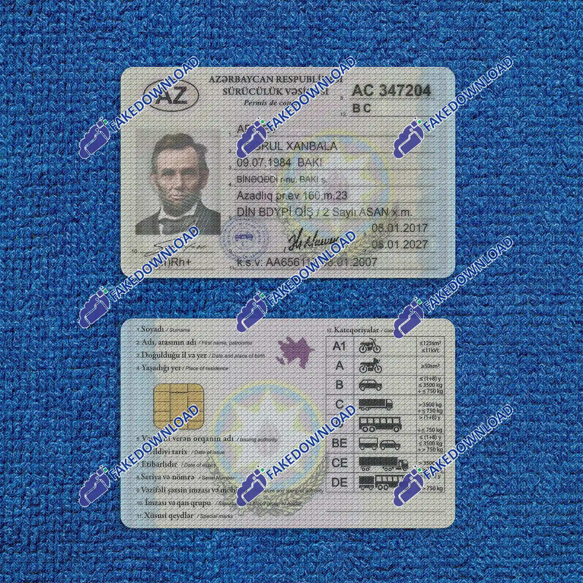 The open file and fake template of the Driver license of Azerbaijan is of 4k quality, this file is similar to the original sample and is presented as an open and fake file in the fake download store.The fake Azerbaijan Driver license file can be downloaded and purchased instantly through this store.